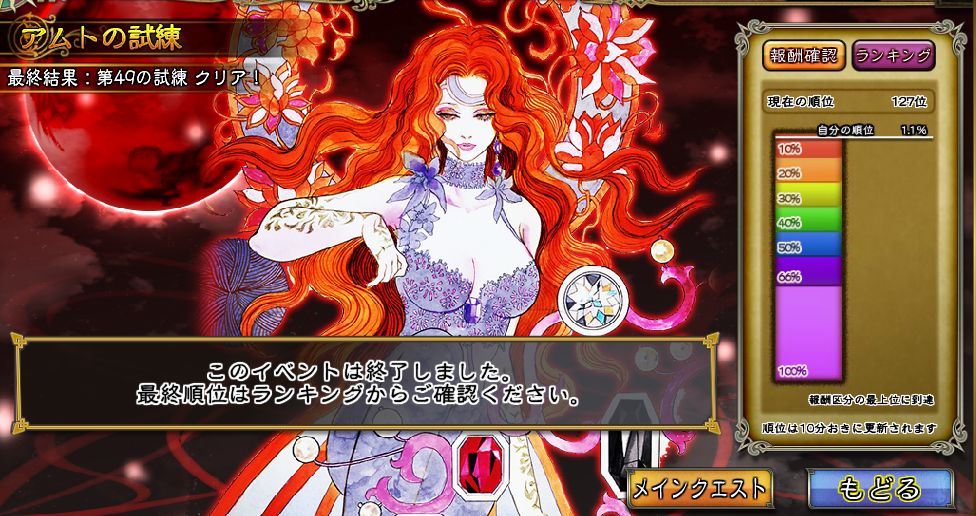 自然回復で1度くらいは50に挑みたかったが、序盤の出遅れが悔やまれる。