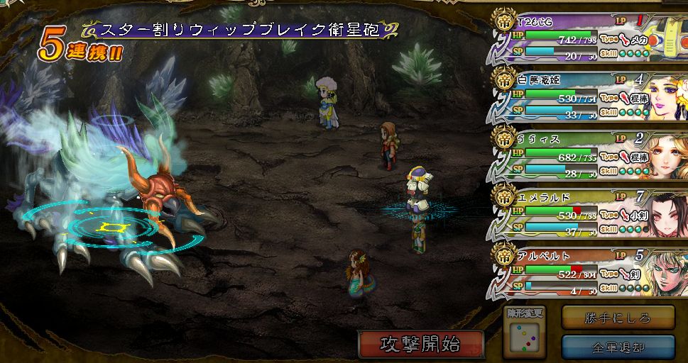 デストロ戦まで行けばストスキ+セルバをかけながらSP回復→技の長期戦になるので、ストスキ要因として1人だった白薔薇を2人に増やす+攻撃専門だったエメにもセルバを装備して、バーバラ一択だったセルバを増やす。