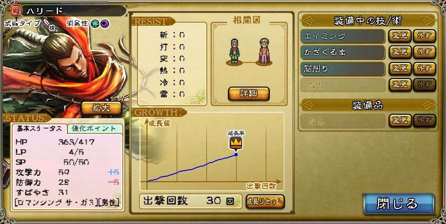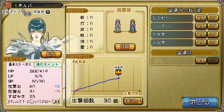 最終:HP602 攻59 防33 す52 (HP+250 3値+57)