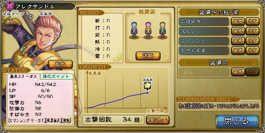 アレクサンドルは成り行き育成+バランス型という訳で、どうしようもなく色のない育ちになってしまっている。