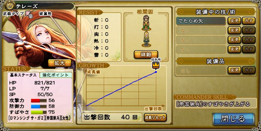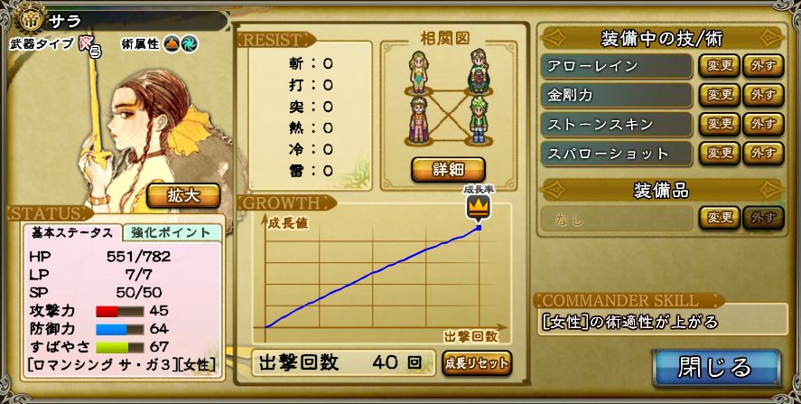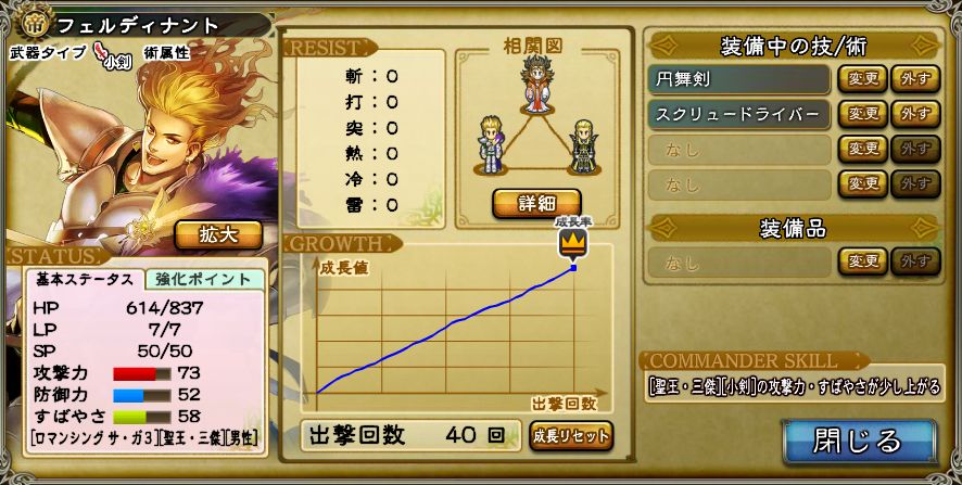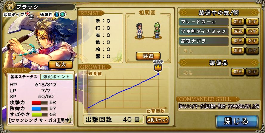 攻カンストで84まで伸びるが、どうせ攻↑の補助をかける事を考えると攻は74くらいまでで良いんじゃないかしらと最近思っている。
