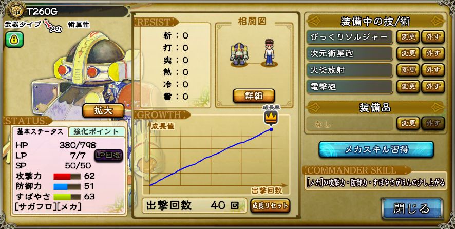 リターン後:HP798 攻62防51す63(HP+384 3値+77)