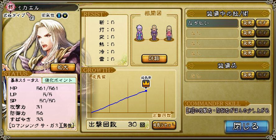 いかんせん壁役なだけに、攻がカンストしても38だから火力に欠けるが、術を使える補助役の位置を与えられたら光を浴びる日が来る事を信じよう。