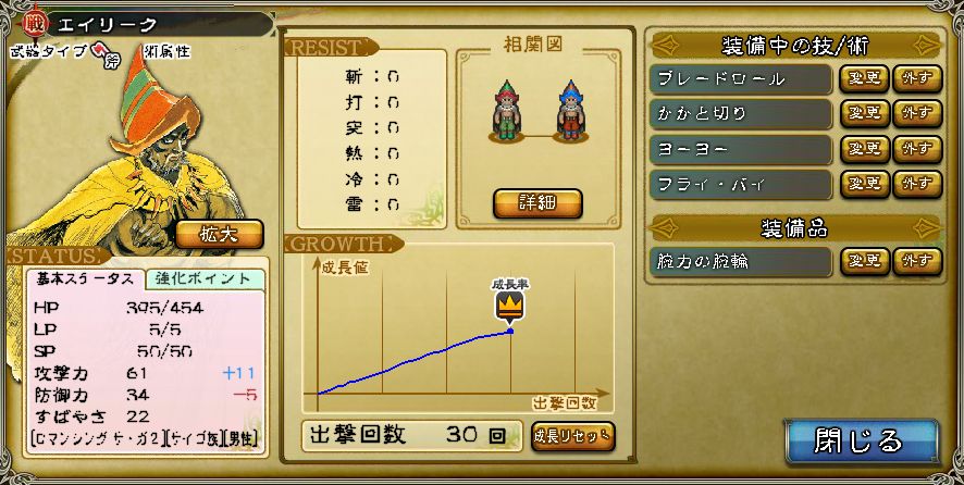 最終:HP454 攻50 防39 す22 (HP+200 3値+42)